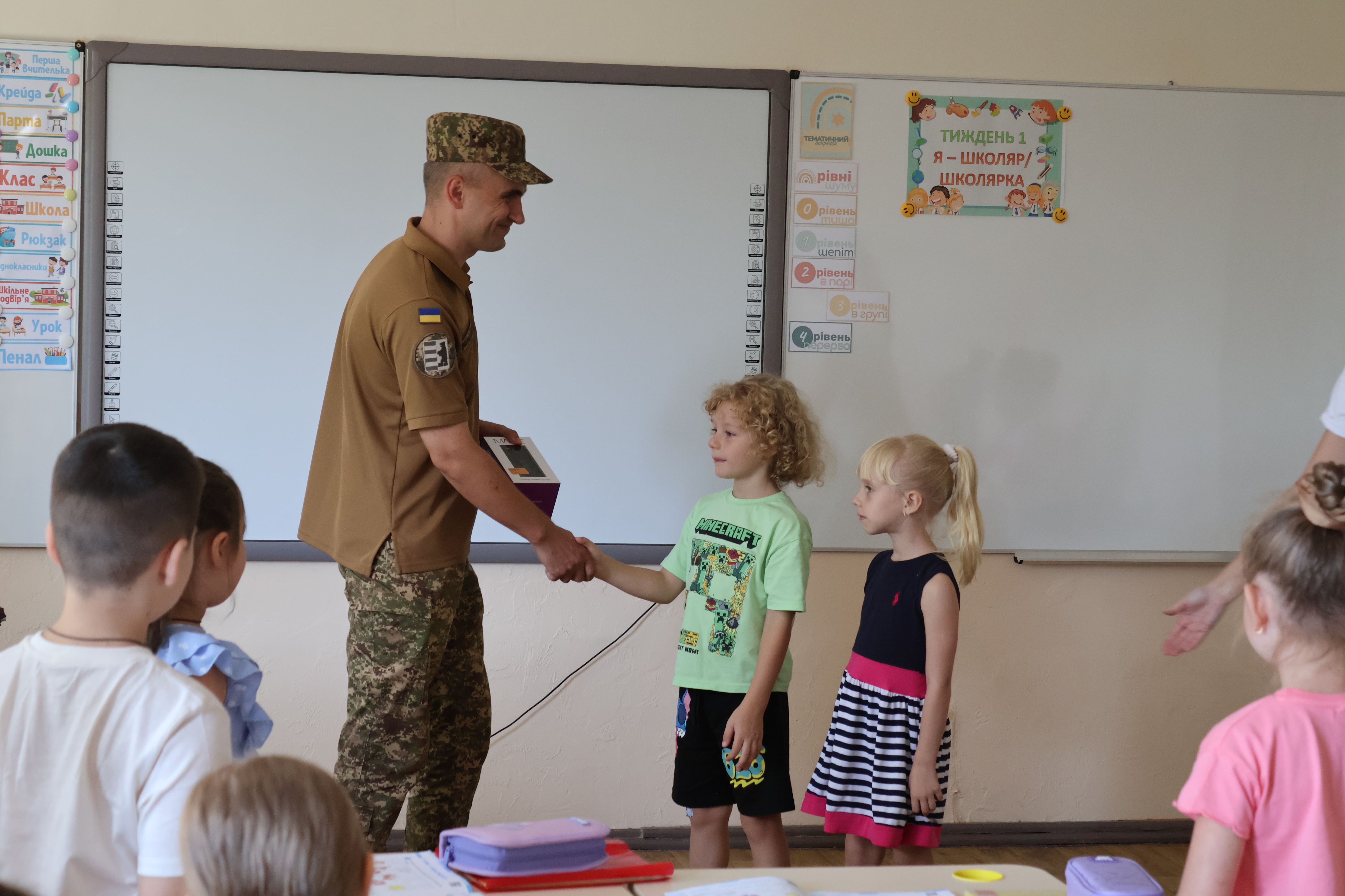 Особливо приємно, що учні самі передали зібрані павербанки та подарунки військовому, а у відповідь отримали надзвичайно цінний подарунок — прапор 26 полку Національної гвардії України.